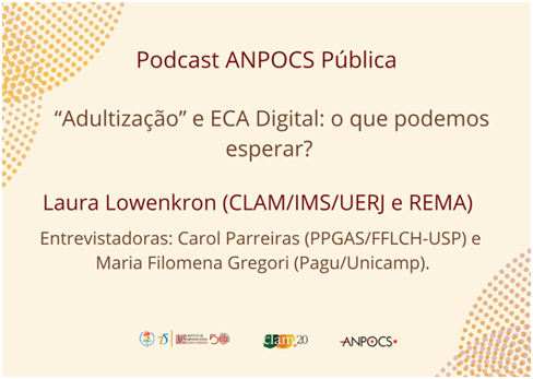 No episódio 12 do podcast ANPOCS Pública, a pesquisadora Laura Lowenkron (CLAM/IMS/UERJ e REMA – Rede Transnacional de pesquisas sobre maternidades destituídas, violadas e violentadas) debate a chamada “adultização” de crianças e adolescentes no ambiente digital. Intitulado “Adultização e ECA Digital: o que podemos esperar? o episódio reflete sobre os impasses sociais, jurídicos e políticos que cercam a proteção de crianças e adolescentes nas redes. A entrevista foi conduzida por Carol Parreiras (PPGAS/FFLCH-USP) e Maria Filomena Gregori (Pagu/Unicamp). Saiba mais em: https://clam.org.br/noticias-clam/podcast-da-anpocs-discute-adultizacao-de-criancas-e-os-desafios-do-eca-digital/31128/