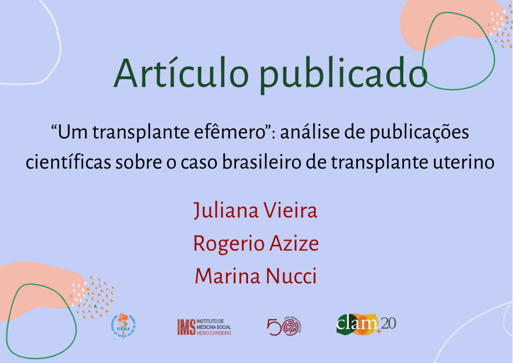 La investigadora Juliana Vieira (CLAM/IMS/UERJ) y los profesores Rogerio Azize (CLAM/IMS/UERJ) y Marina Nucci (CLAM/IMS/UERJ) publicaron el artículo “Un trasplante efímero”: análisis de publicaciones científicas sobre el caso brasileño de trasplante uterino, en la Physis: Revista de Saúde Coletiva, publicación vinculada al Instituto de Medicina Social Hésio Cordeiro, de la Universidad del Estado de Río de Janeiro (IMS-UERJ).
