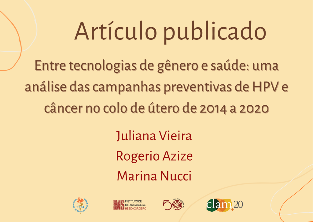La investigadora Juliana Vieira (CLAM/IMS/UERJ) y los profesores Rogerio Azize (CLAM/IMS/UERJ) y Marina Nucci (CLAM/IMS/UERJ) publicaron el artículo “Entre tecnologías de género y de la salud: un análisis de las campañas preventivas de HPV y cáncer de cuello uterino de 2014 a 2020”, en la Revista Ciência e Saúde Coletiva, editada por la Asociación Brasileña de Salud Colectiva (Abrasco).