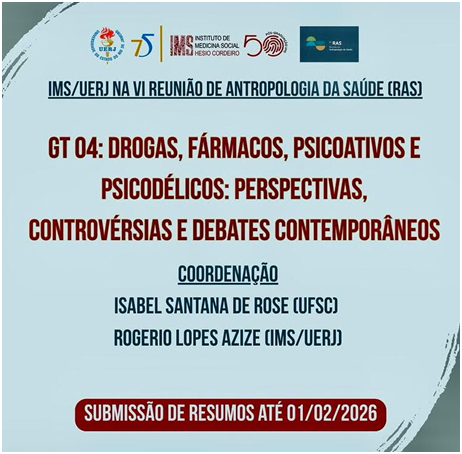 Reunión de Antropología de la Salud (RAS), del 22 al 24/04/26, en la Universidad Federal de Rio Grande do Sul (UFRGS), en Porto Alegre. El profesor Rogerio Azize (CLAM/IMS/UERJ) coordinará, junto con la profesora Isabel de Rose (UFSC), el GT04 “Drogas, fármacos, psicoactivos y psicodélicos: perspectivas, controversias y debates contemporáneos”. Se aceptarán resúmenes hasta el día 01/02/2026. Más información en: https://www.ufrgs.br/ras/.
