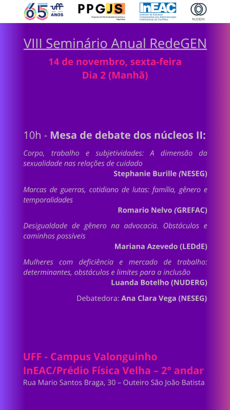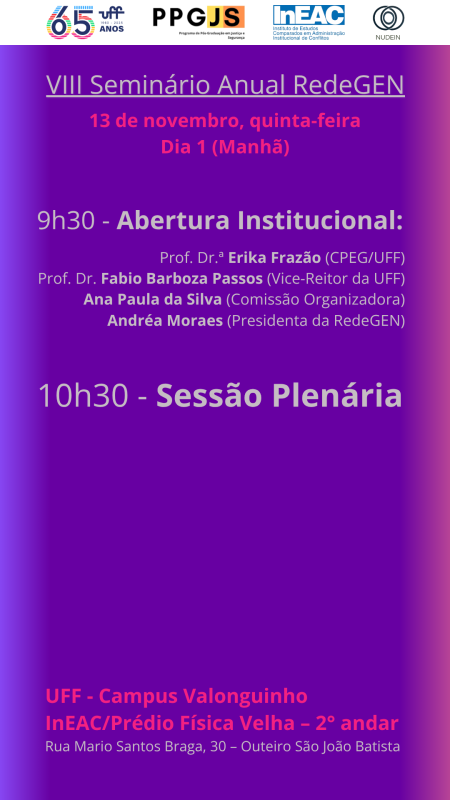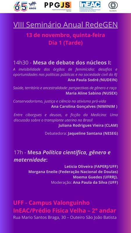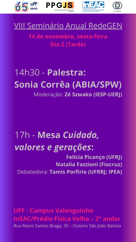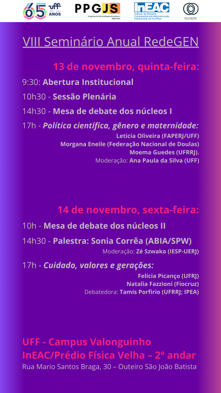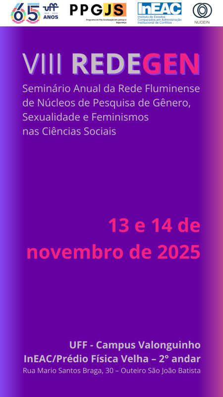 El VIII Seminario Anual de RedeGen, la Red Fluminense de Núcleos de Investigación de Género, Sexualidad y Feminismos en Ciencias Sociales, se llevará a cabo los días 13 y 14/11/25 (jueves y viernes), en la Universidad Federal Fluminense (UFF), en el Campus Valonguinho InEAC/Edificio Física Vieja – 2º piso. Rua Mario Santos Braga, 30 – Outeiro São João Batista, Niterói.