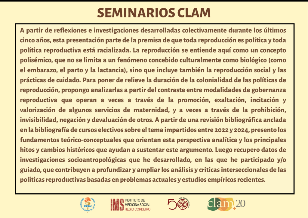 Resumen: A partir de reflexiones e investigaciones desarrolladas colectivamente durante los últimos cinco años, esta presentación parte de la premisa de que toda reproducción es política y toda política reproductiva está racializada. La reproducción se entiende aquí como un concepto polisémico, que no se limita a un fenómeno concebido culturalmente como biológico (como el embarazo, el parto y la lactancia), sino que incluye también la reproducción social y las prácticas de cuidado. Para poner de relieve la duración de la colonialidad de las políticas de reproducción, propongo analizarlas a partir del contraste entre modalidades de gobernanza reproductiva que operan a veces a través de la promoción, exaltación, incitación y valorización de algunos servicios de maternidad, y a veces a través de la prohibición, invisibilidad, negación y devaluación de otros. A partir de una revisión bibliográfica anclada en la bibliografía de cursos electivos sobre el tema impartidos entre 2022 y 2024, presento los fundamentos teórico-conceptuales que orientan esta perspectiva analítica y los principales hitos y cambios históricos que ayudan a sustentar este argumento. Luego recupero datos de investigaciones socioantropológicas que he desarrollado, en las que he participado y/o guiado, que contribuyen a profundizar y ampliar los análisis y críticas interseccionales de las políticas reproductivas basadas en problemas actuales y estudios empíricos recientes.