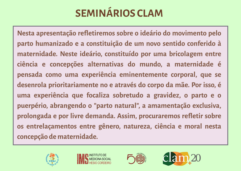 Os Seminários CLAM, promovidos pelo Centro Latino-Americano em Sexualidade e Direitos Humanos (CLAM/IMS/UERJ), reúnem estudantes, pesquisadores e demais interessados/as nas temáticas de gênero, sexualidade e direitos humanos para constituir um espaço de formação e de trocas de informações a partir de trabalhos acadêmicos que perpassam a atuação do Centro. Os encontros ocorrem na modalidade presencial e não é necessária inscrição prévia.