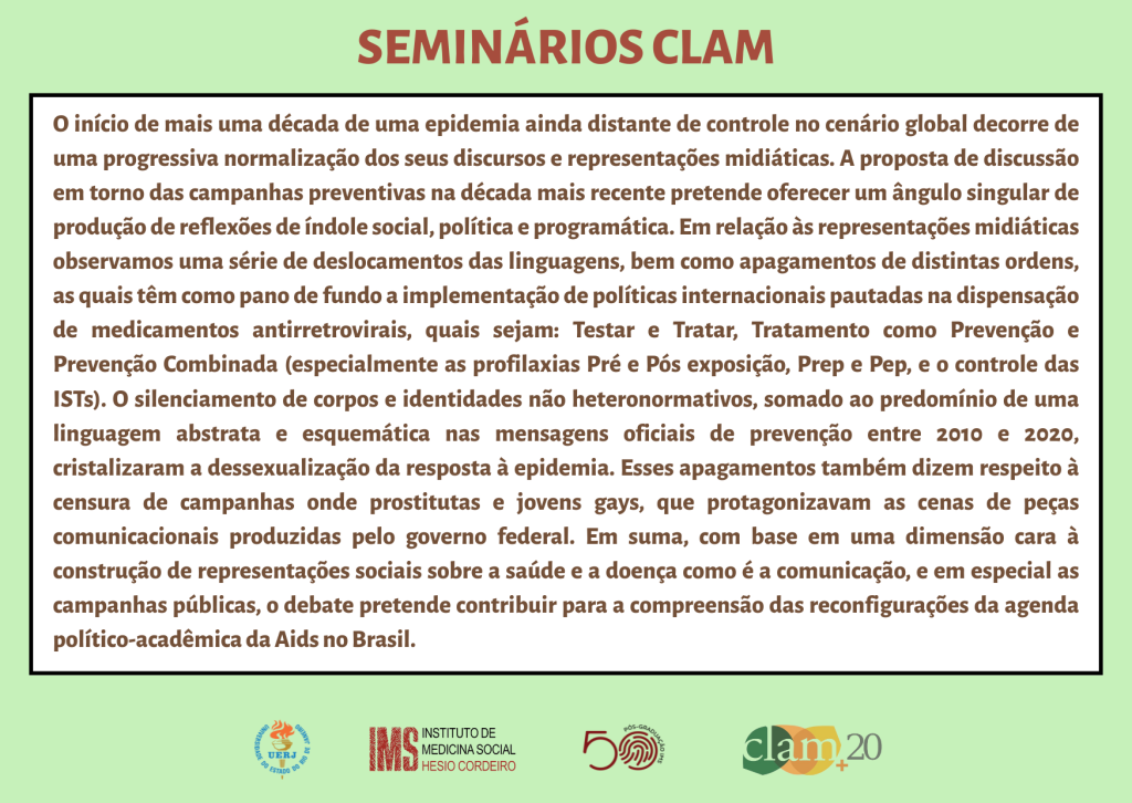 Resumo: O início de mais uma década de uma epidemia ainda distante de controle no cenário global decorre de uma progressiva normalização dos seus discursos e representações midiáticas. A proposta de discussão em torno das campanhas preventivas na década mais recente pretende oferecer um ângulo singular de produção de reflexões de índole social, política e programática. Em relação às representações midiáticas observamos uma série de deslocamentos das linguagens, bem como apagamentos de distintas ordens, as quais têm como pano de fundo a implementação de políticas internacionais pautadas na dispensação de medicamentos antirretrovirais, quais sejam: Testar e Tratar, Tratamento como Prevenção e Prevenção Combinada (especialmente as profilaxias Pré e Pós exposição, Prep e Pep, e o controle das ISTs). O silenciamento de corpos e identidades não heteronormativos, somado ao predomínio de uma linguagem abstrata e esquemática nas mensagens oficiais de prevenção entre 2010 e 2020, cristalizaram a dessexualização da resposta à epidemia. Esses apagamentos também dizem respeito à censura de campanhas onde prostitutas e jovens gays, que protagonizavam as cenas de peças comunicacionais produzidas pelo governo federal. Em suma, com base em uma dimensão cara à construção de representações sociais sobre a saúde e a doença como é a comunicação, e em especial as campanhas públicas, o debate pretende contribuir para a compreensão das reconfigurações da agenda político-acadêmica da Aids no Brasil.
