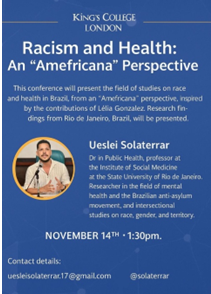 O professor Ueslei Solaterrar (CLAM/IMS/UERJ) proferiu a palestra “Racism and Health: An `Amefricana` Perspective” no dia 14 de novembro, no Department of Global Health and Social Medicine, no King’s College, em Londres, Inglaterra.